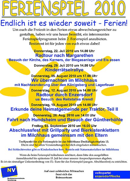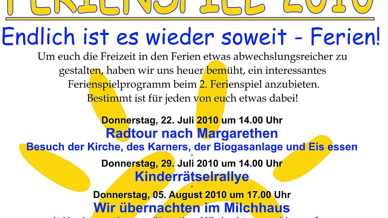 FERIENSPIEL 2010 Endlich ist es wieder soweit - Ferien! Um euch die Freizeit in den Ferien etwas abwechslungsreicher zu gestalten, haben wir uns auch heuer bemüht, ein interessantes Ferienspielprogramm beim 2. Ferienspiel anzubieten. Bestimmt ist für jeden von euch etwas dabei! Hol dir deinen Ferienpass am 19. Juni bei der Sonnwendfeier ab. Donnerstag, 22. Juli 2010 um 14.00 Uhr Radtour nach Margarethen Besuch der Kirche, des Karners, der Biogasanlage und Eisessen in der Margarethner Stub´n • Donnerstag, 29. Juli 2010 um 14.00 Uhr Kinderrätselrallye • Donnerstag, 05. August 2010 um 17.00 Uhr Wir übernachten im Milchhaus mit Nachtwanderung über den Königsberg und Lagerfeuer • Donnerstag, 12. August 2010 um 14.00 Uhr Radtour durch Enzersdorf Besuch der Polsterer Mühle und des Reitstalles Krendl • Donnerstag, 19. August 2010 um 14.00 Uhr Erkunde deine Heimatgemeinde per Traktor, Teil II • Donnerstag, 26. August 2010 um 14.00 Uhr Fahrt nach Hundsheim und Besuch der Güntherhöhle • Freitag, 03. September 2010 um 16.00 Uhr Abschlussfest mit Grillparty und Bierkistenklettern im Milchhaus gemeinsam mit den Eltern Treffpunkt für alle Ferienspiele ist das Milchhaus Dreifaltigkeitsplatz 13. Auf euer zahlreiches Mitmachen freut sich das Betreuerteam
