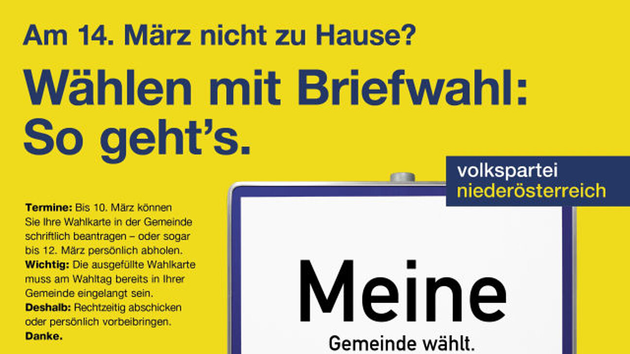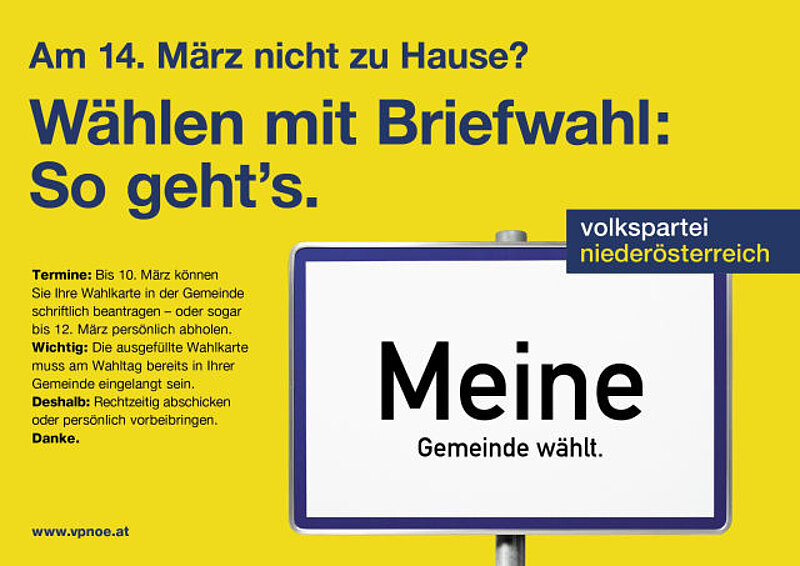 Am 14. März nicht zu Hause? Wählen mit Briefwahl: So geht´s! Termine: Bis 10. März können Sie Ihre Wahlkarte in der Gemiende schriftlich beantragen - oder sogar bis 12. März persönlich abholen. Wichitg: Die ausgefüllte Wahlkarte muss am Wahltag bereits in Ihrer Gemeinde eingelangt sein. Deshalb: rechtzeitig abschicken oder persönlich vorbeibringen. Danke!