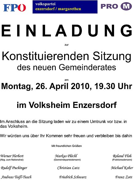 E I N L A D U N G zur Konstituierenden Sitzung des neuen Gemeinderates am Montag, 26. April 2010, 19.30 Uhr im Volksheim Enzersdorf Im Anschluss an die Sitzung laden wir zu einem Umtrunk vor bzw. in das Volksheim. Wir würden uns über Ihr Kommen sehr freuen und verbleiben bis dahin Mit freundlichen Grüßen Markus Plöchl (Gemeindeparteiobmann, ÖVP) Roland Floh (Fraktionsobmann, PRO M) Werner Herbert (Abg. zum Nationalrat, FPÖ Rudolf Puchinger Christian Lutz Andreas Toifl-Tusch Friedrich Schwarz Hans Wannasek Werner Klaus Ing. Michael Kober Franz Zott
