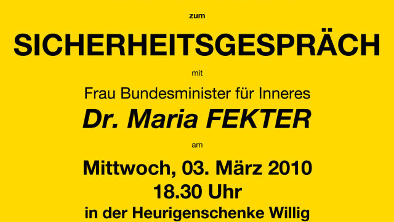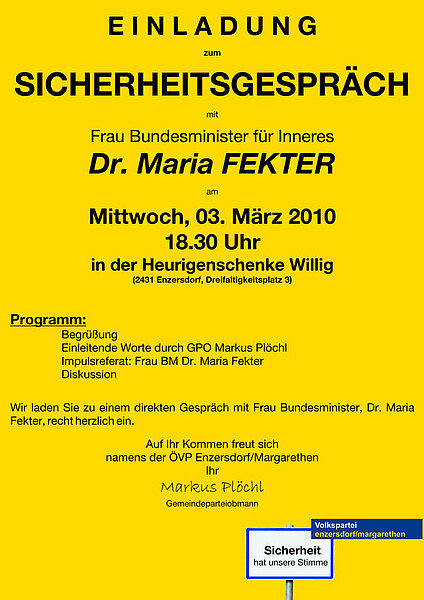 E I N L A D U N G zum SICHERHEITSGESPRÄCH mit Frau Bundesminister für Inneres Dr. Maria FEKTER am Mittwoch, 03. März 2010 18.30 Uhr in der Heurigenschenke Willig (2431 Enzersdorf, Dreifaltigkeitsplatz 3) Programm: Begrüßung Einleitende Worte durch GPO Markus Plöchl Impulsreferat: Frau BM Dr. Maria Fekter Diskussion Wir laden Sie zu einem direkten Gespräch mit Frau Bundesminister, Dr. Maria Fekter, recht herzlich ein. Auf Ihr Kommen freut sich namens der ÖVP Enzersdorf/Margarethen Ihr Markus Plöchl Gemeindeparteiobmann