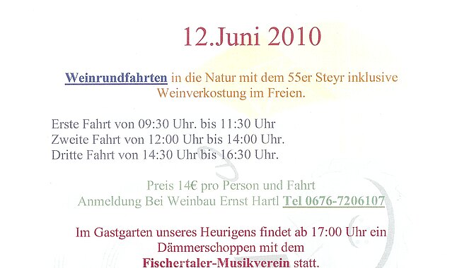 Weinrundfahrt in die Natur mit dem 55er Steyr inklusive Weinverkostung im Freien Erste Fahrt: 09.30…